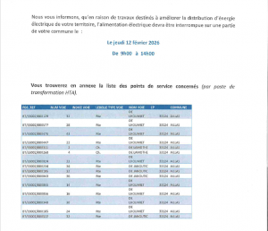En raison des travaux d’aménagement de l’entrée de bourg de la RD 110 côté Berthez du lundi au vendredi de 8h30 à 17h30, la circulation sera déviée du 12 janvier au 15 mars 2026 sauf riverains, transports scolaires et secours. Nous vous remercions pour votre indulgence et sommes désolés des désagréments