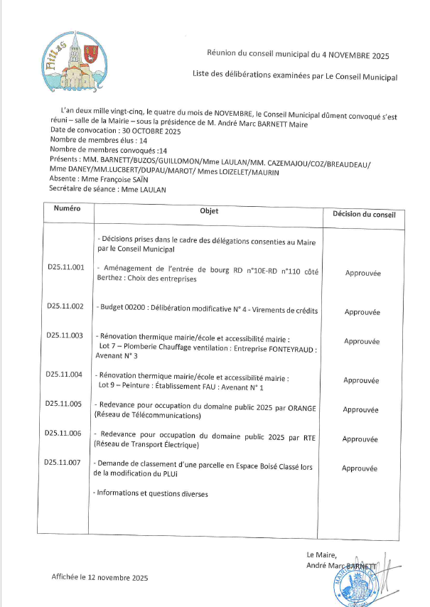 COMPTE RENDU DU CONSEIL MUNICIPAL Réunion du 12 Mars 2024 Réunion du 11 Avril 2024 Réunion du 23 Avril 2024 Réunion du 21 Mai 2024 Réunion du 9 Juillet 2024 Réunion du 10 Septembre 2024 Réunion du 8 Octobre 2024 Réunion du 19 Novembre 2024 Réunion du 10 Décembre 2024 Réunion du 4 Février 2025 Réunion du 25 Mars 2025 Réunion du 1er Avril 2025 Réunion du 20 Mai 2025 Réunion du 16 Juin 2025 Réunion du 8 Juillet 2025 Réunion du 26 Aout 2025 LISTES DES DÉLIBÉRATIONS EXAMINÉES PAR LE CONSEIL MUNICIPAL Liste des délibérations approuvées séance du 11 Avril 2024 Liste des délibérations approuvées séance du 23 Avril 2024 Listes des délibérations approuvées du 21 Mai 2024 Listes des délibérations approuvées du 9 Juillet 2024 Listes des délibérations approuvées du 19 Novembre 2024 Listes des délibérations approuvées du 10 Décembre 2024 Listes des délibérations approuvées du 4 Février 2025 Listes des délibérations approuvées du 25 Mars 2025 Listes des délibérations approuvées du 1er Avril 2025 Listes des délibérations approuvées du 20 Mai 2025 Listes des délibérations approuvées du 16 Juin 2025 Listes des délibérations approuvées du 8 Juillet 2025 Listes des délibérations approuvées du 26 Août 2025 Listes des délibérations approuvées du 4 Novembre 2025